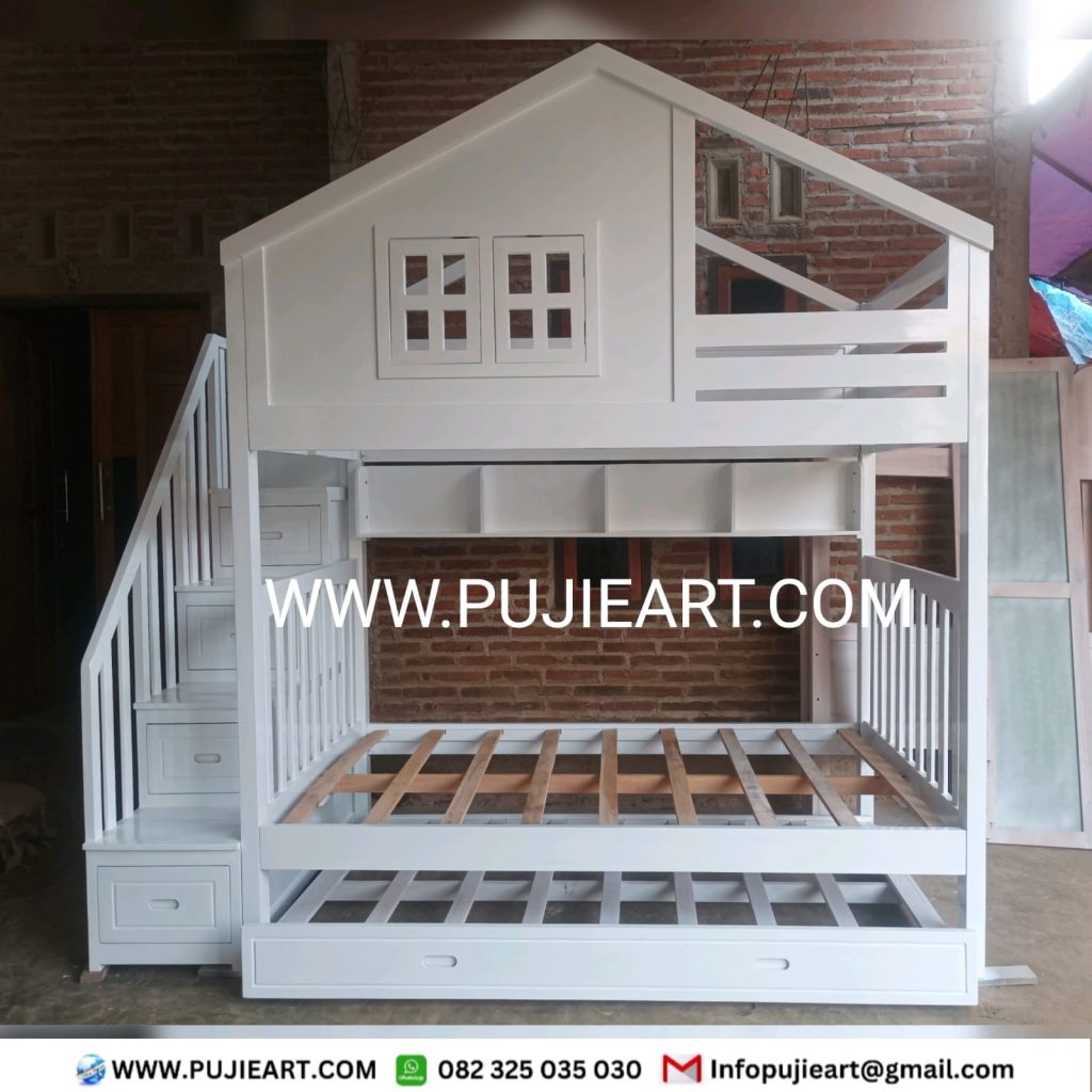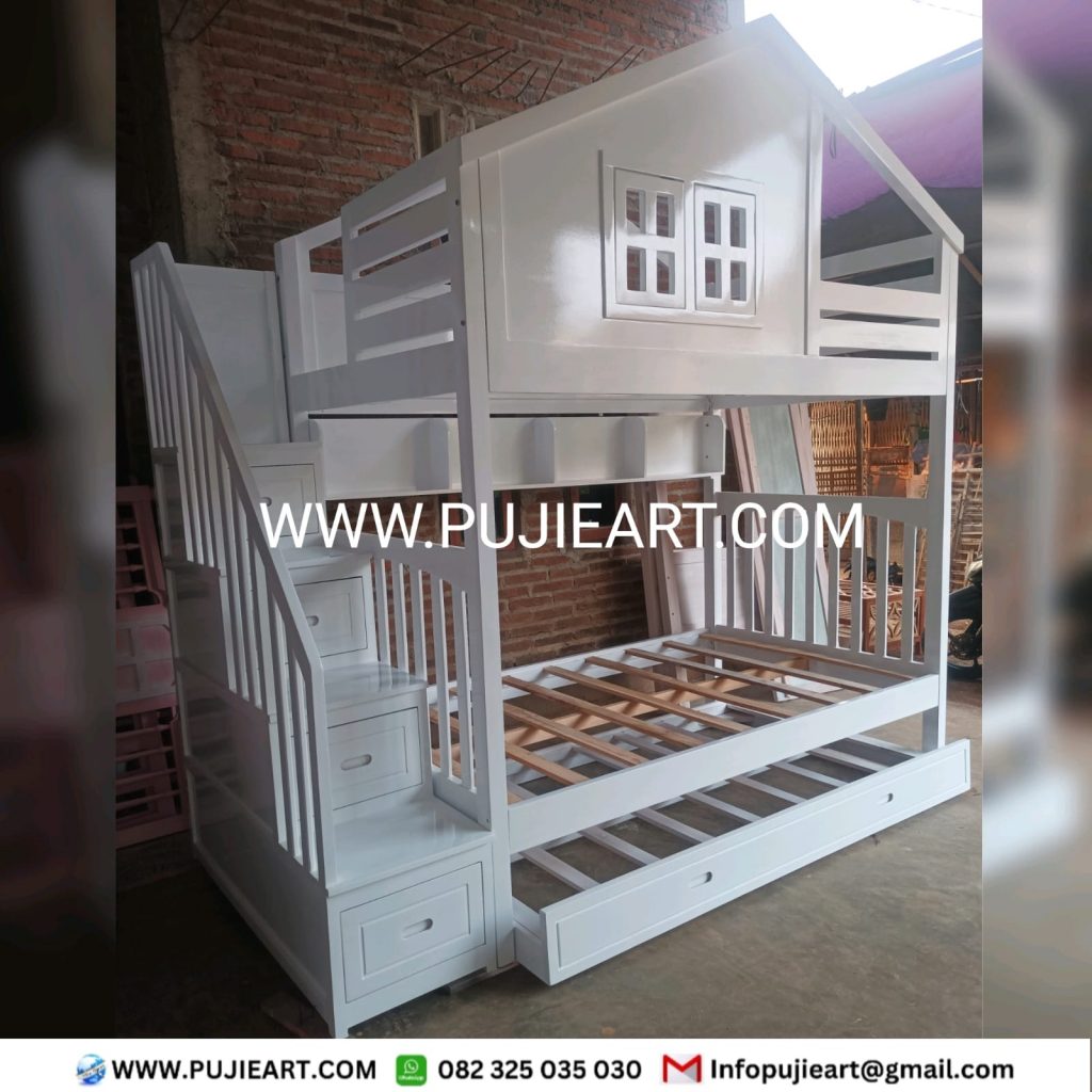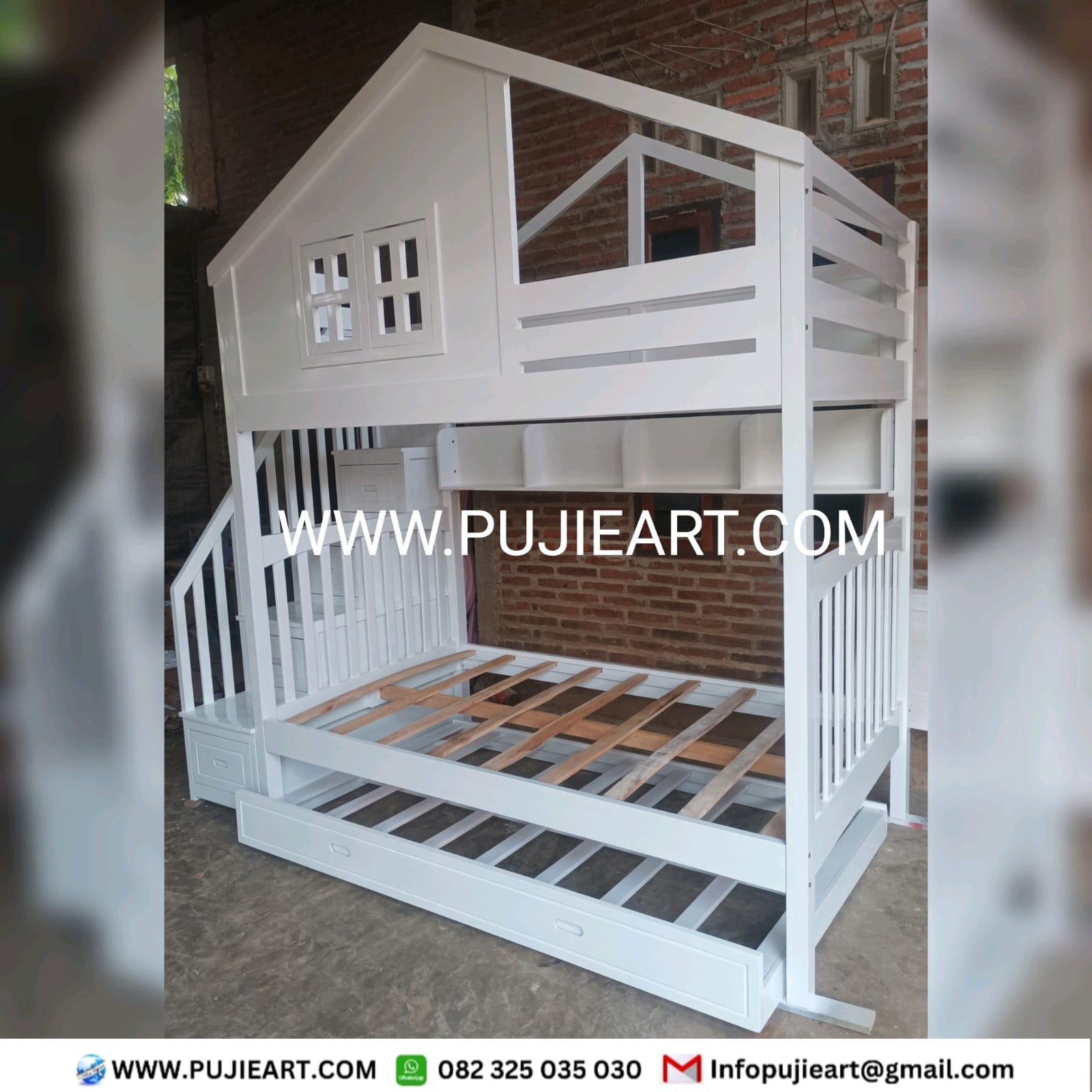 Selain tampil menarik, tempat tidur tingkat ini juga dirancang sebagai solusi cerdas untuk menghemat ruang. Dengan dua susun yang fungsional, kamar anak menjadi lebih lega dan tertata rapi, sehingga masih tersedia ruang untuk belajar atau bermain. Tangga dirancang ergonomis agar mudah dan aman digunakan, sementara finishing halus memberikan sentuhan elegan sekaligus nyaman saat disentuh.