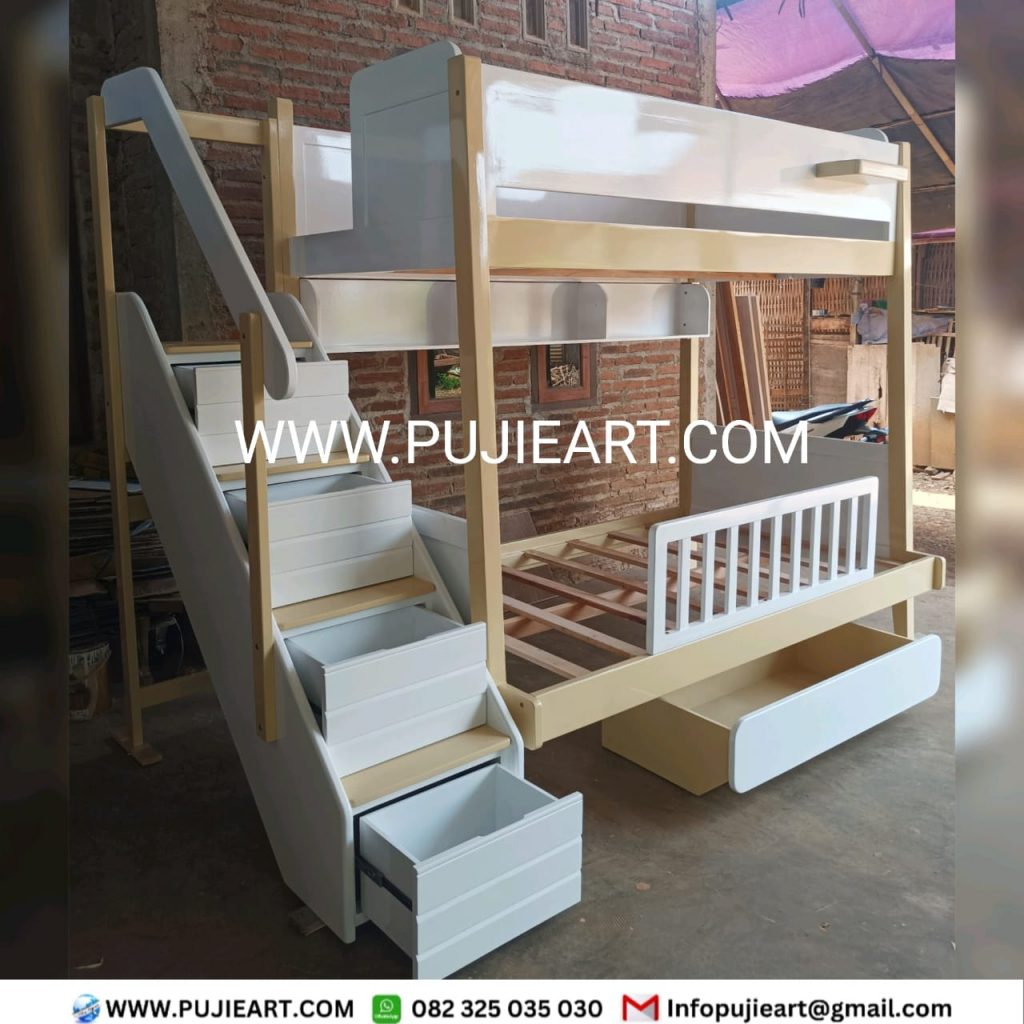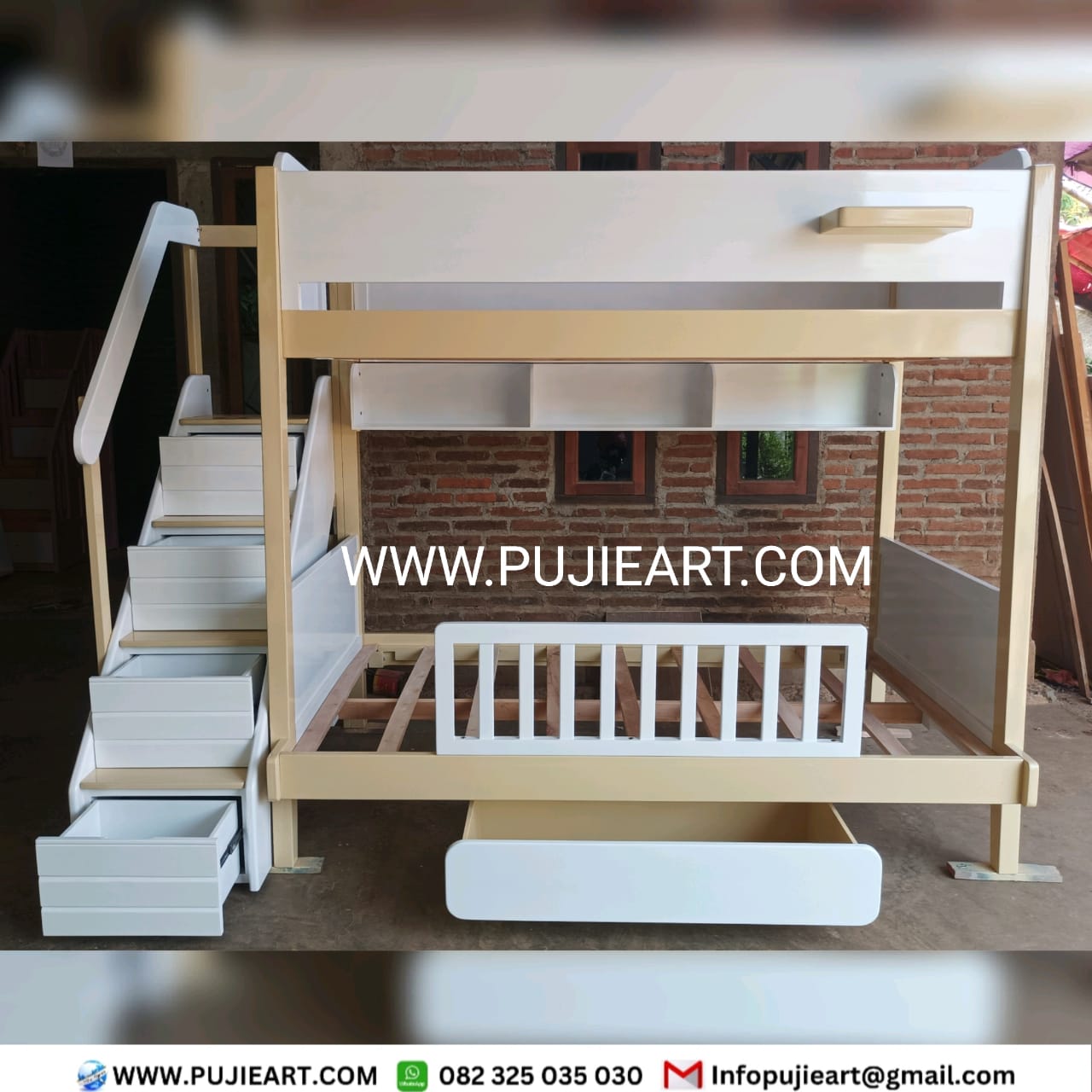 Selain tampil menarik, tempat tidur tingkat ini juga dirancang sebagai solusi cerdas untuk menghemat ruang. Dengan dua susun yang fungsional, kamar anak menjadi lebih lega dan tertata rapi, sehingga masih tersedia ruang untuk belajar atau bermain. Tangga dirancang ergonomis agar mudah dan aman digunakan, sementara finishing halus memberikan sentuhan elegan sekaligus nyaman saat disentuh.