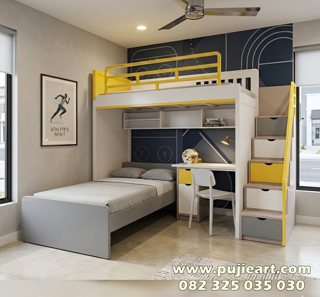 Selain tampil menarik, tempat tidur tingkat ini juga dirancang sebagai solusi cerdas untuk menghemat ruang. Dengan dua susun yang fungsional, kamar anak menjadi lebih lega dan tertata rapi, sehingga masih tersedia ruang untuk belajar atau bermain. Tangga dirancang ergonomis agar mudah dan aman digunakan, sementara finishing halus memberikan sentuhan elegan sekaligus nyaman saat disentuh.