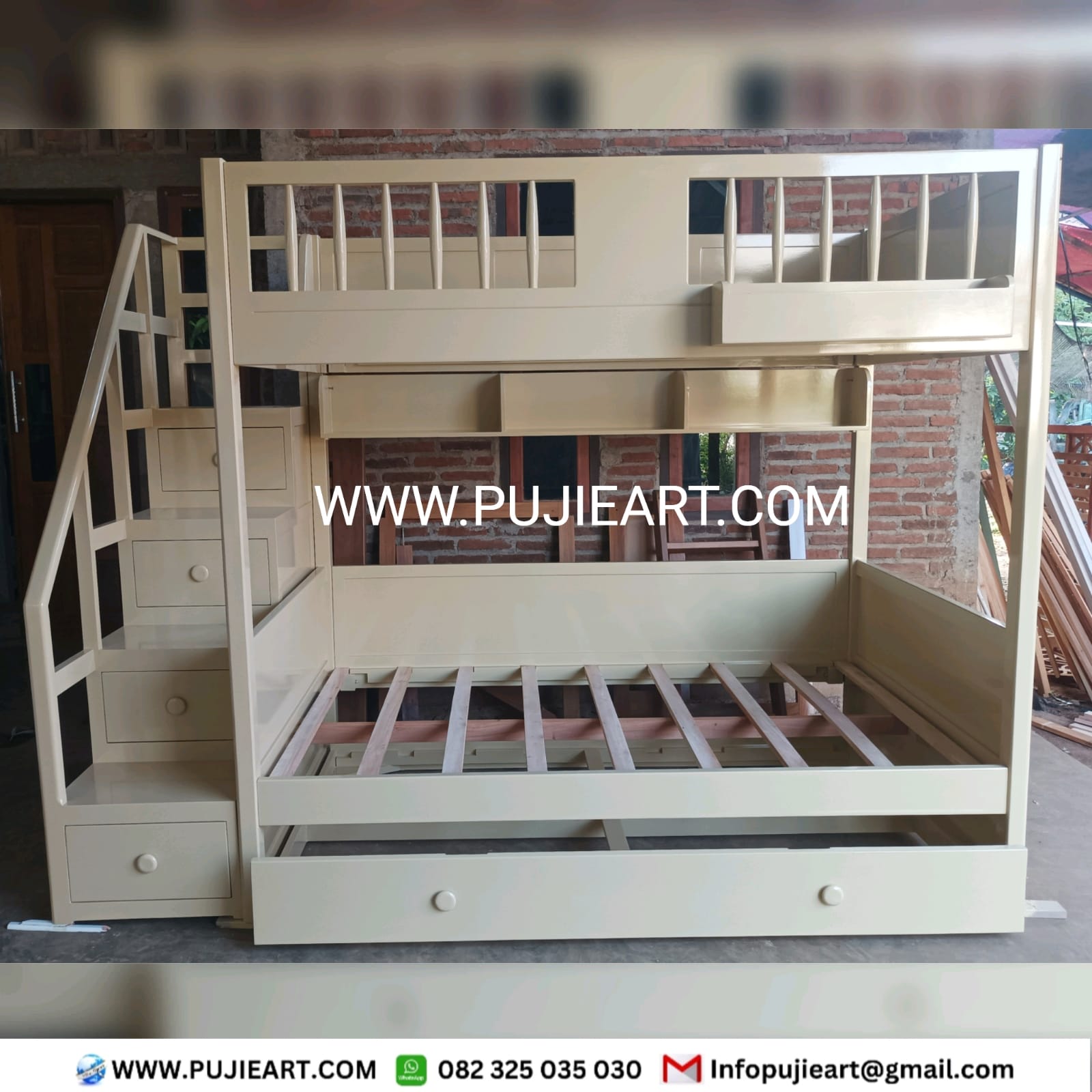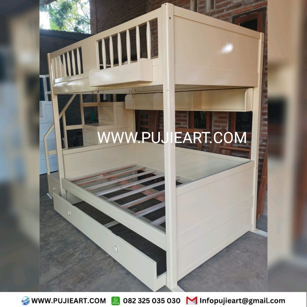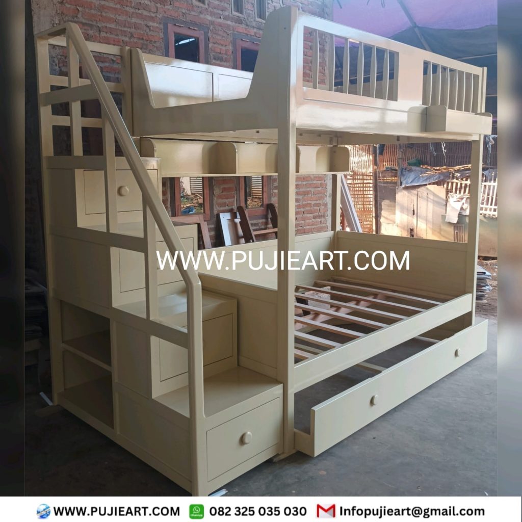 Selain tampil menarik, tempat tidur tingkat ini juga dirancang sebagai solusi cerdas untuk menghemat ruang. Dengan dua susun yang fungsional, kamar anak menjadi lebih lega dan tertata rapi, sehingga masih tersedia ruang untuk belajar atau bermain. Tangga dirancang ergonomis agar mudah dan aman digunakan, sementara finishing halus memberikan sentuhan elegan sekaligus nyaman saat disentuh.
