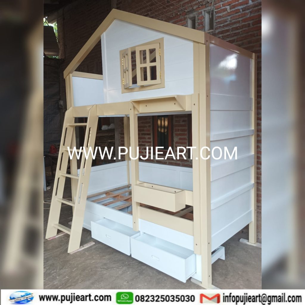 Selain tampil menarik, tempat tidur tingkat ini juga dirancang sebagai solusi cerdas untuk menghemat ruang. Dengan dua susun yang fungsional, kamar anak menjadi lebih lega dan tertata rapi, sehingga masih tersedia ruang untuk belajar atau bermain. Tangga dirancang ergonomis agar mudah dan aman digunakan, sementara finishing halus memberikan sentuhan elegan sekaligus nyaman saat disentuh.